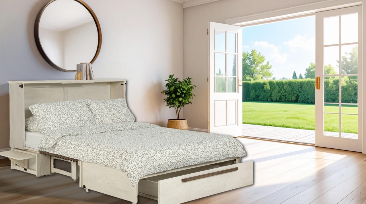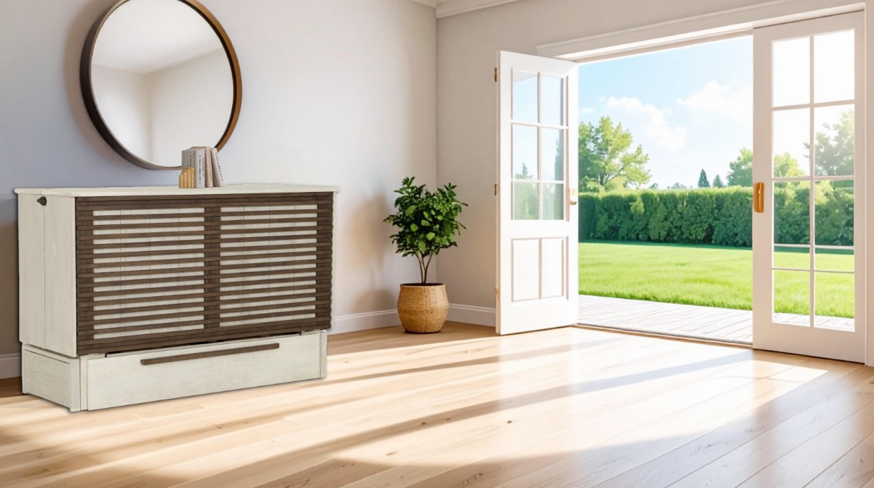 solution. It converts from a stylish cabinet to a comfortable queen-sized bed in under a minute while taking up