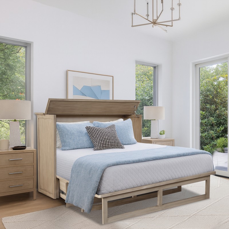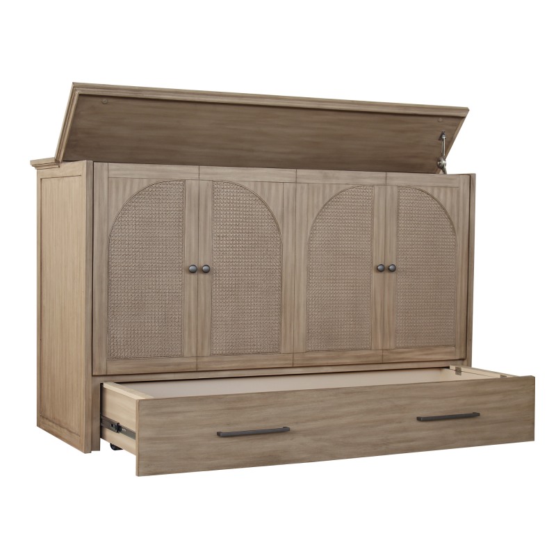 Paloma Queen Size Wooden Cabinet Bed in Natural Finish with USB Port, Drawer, and 6-Inch Tri-Fold Memory Foam Mattress